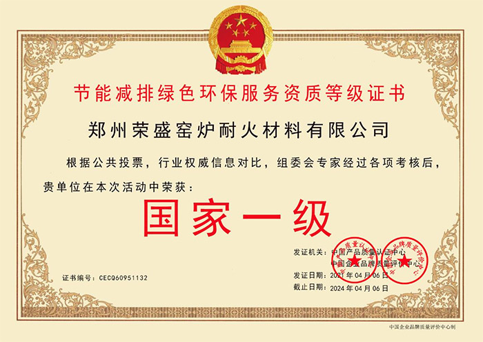春風沐雨,捷報傳音。近日,鄭州榮盛窯爐耐火材料有限公司被中國產品質量認證中心、中國企業品質質量評價中心等權威機構聯合授予“節能減排綠色環保服務資質等級證書”。