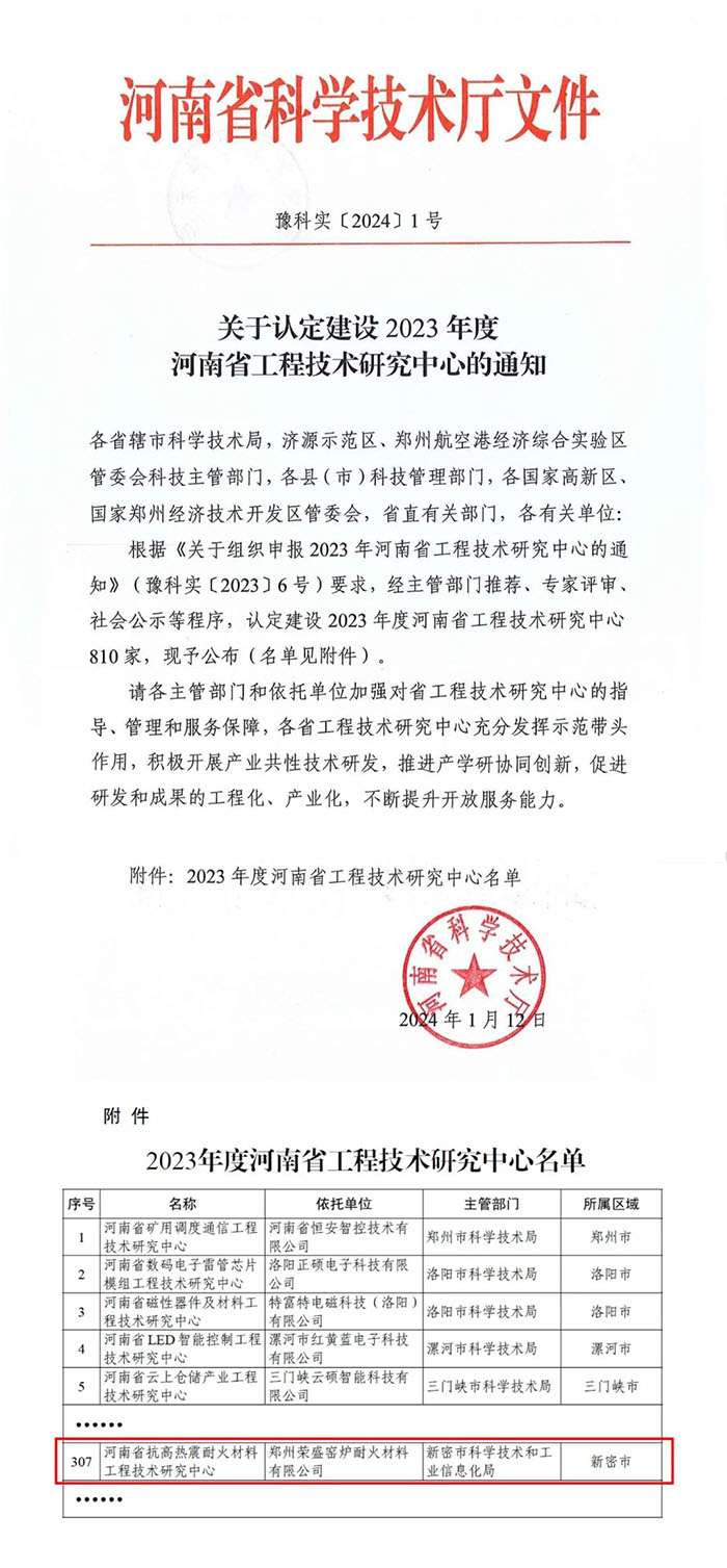 近日,河南省科學技術廳發布了《關于認定建設2023年度河南省工程技術研究中心的通知》。經申報、主管部門推薦、專家論證和研究等程序,鄭州榮盛窯爐耐火材料有限公司(以下簡稱“榮盛耐材”)申報的“河南省抗高熱震耐火材料工程技術研究中心”正式獲批。