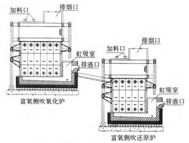 圖1:富氧側(cè)吹氧化爐與還原爐結(jié)構(gòu)圖